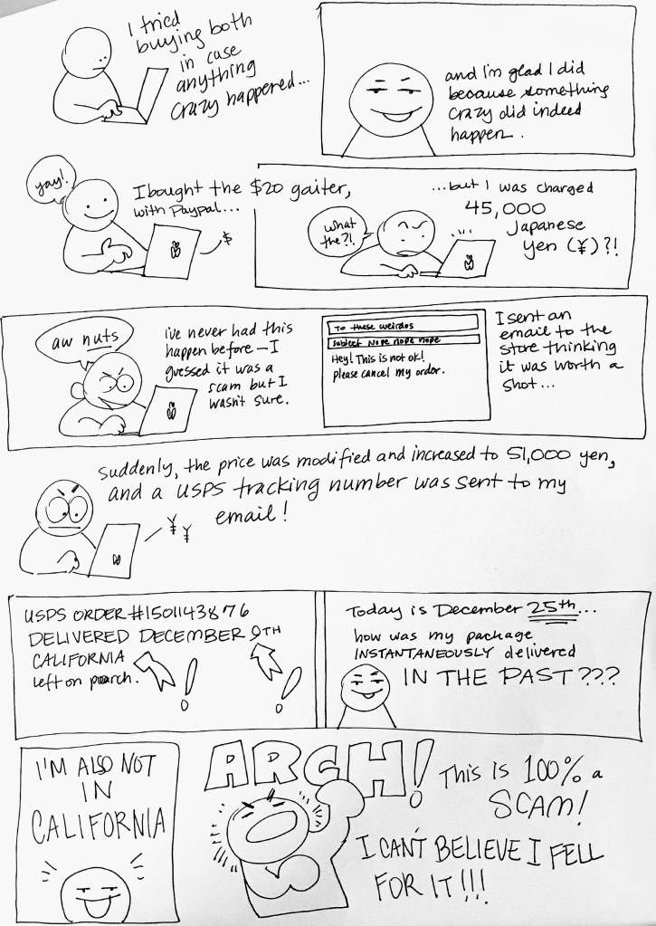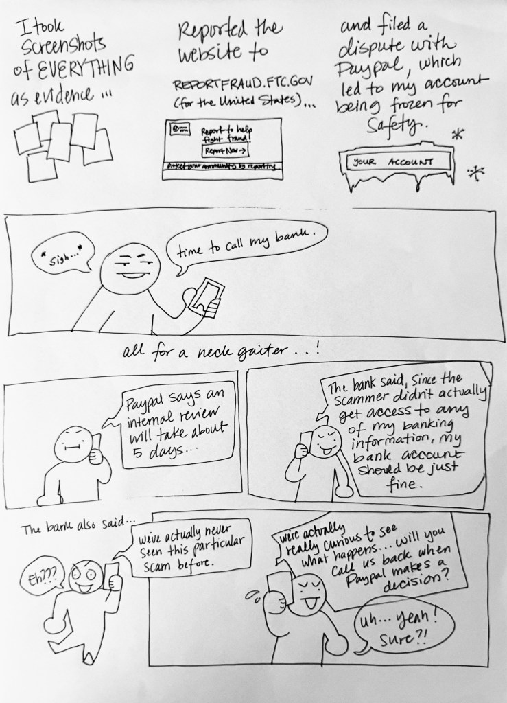 I immediately reported the seller and started a claim through PayPal, and once the holidays were over I called my bank for advice. The seller didn’t get access to my banking information because I didn’t put in my card/bank info when making the purchase– I used PayPal as a proxy– and I think that saved me a LOT of trouble.