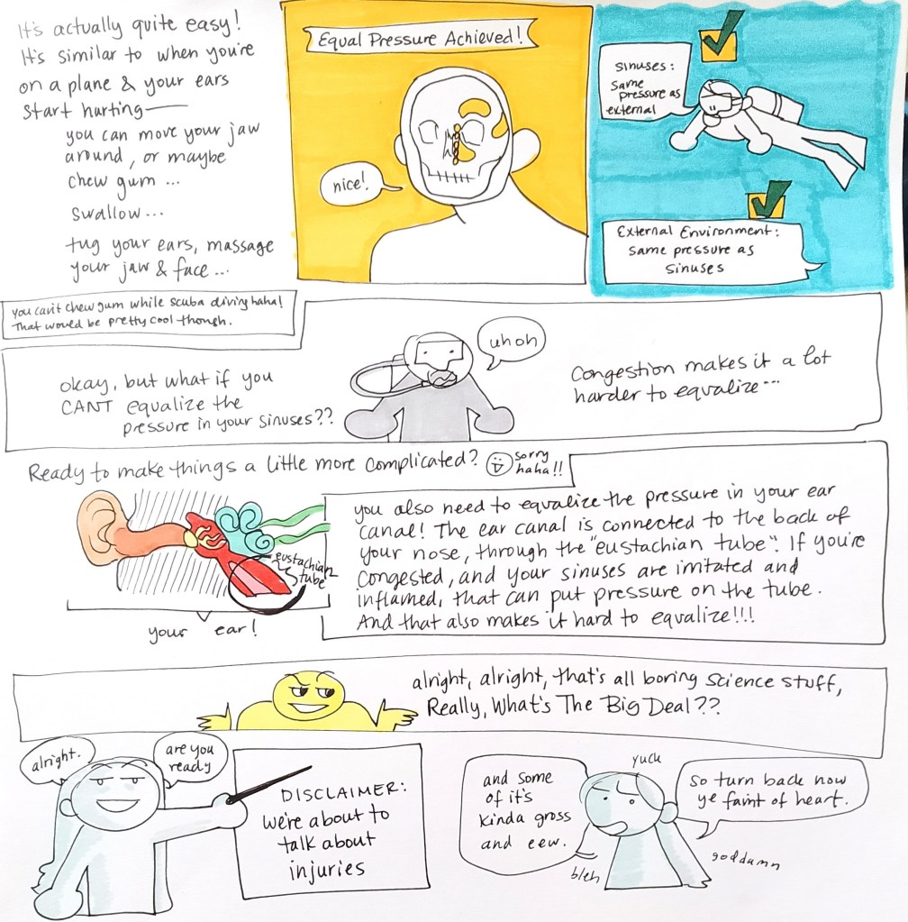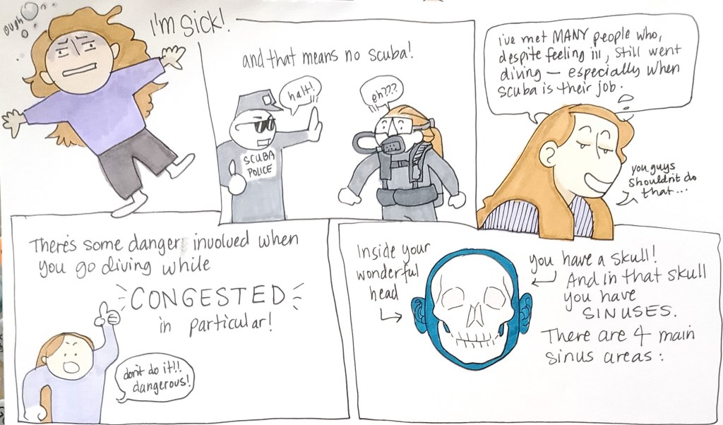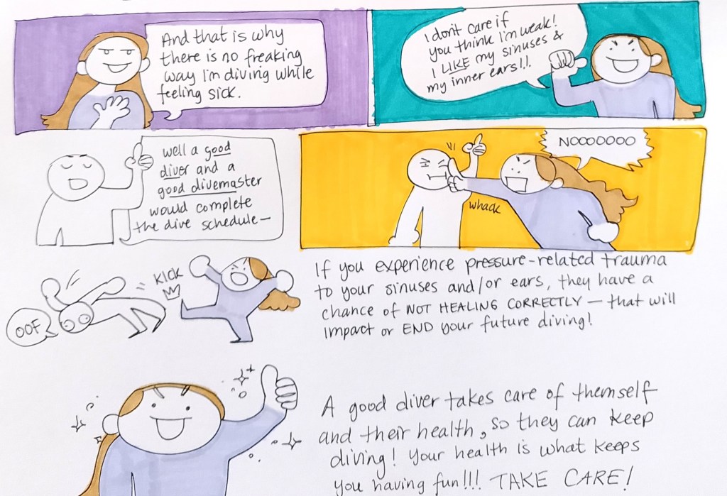 I’ve met plenty of divers who still go out when they’re feeling under the weather– and they’ve been fine– but the potential for complications and injury are high when you’re sick in certain ways. Anything involving your sinuses or inner ear could more easily lead to an injury that ends your diving career.