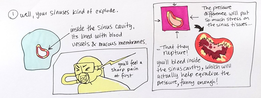 A traumatized sinus will eventually heal, but it will take a long time and it might be too sensitive in the future to handle the kind of pressure changes that happen during scuba. A blown-out eardrum on the other hand doesn’t heal or repair itself, so a diver will need surgery. Even then they probably won’t be able to dive in the future.